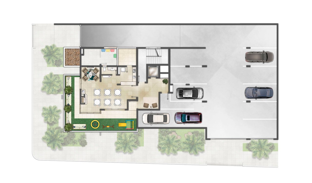 Planta segundo pavimento /salão de festas com terraço e espaço kids e garagem