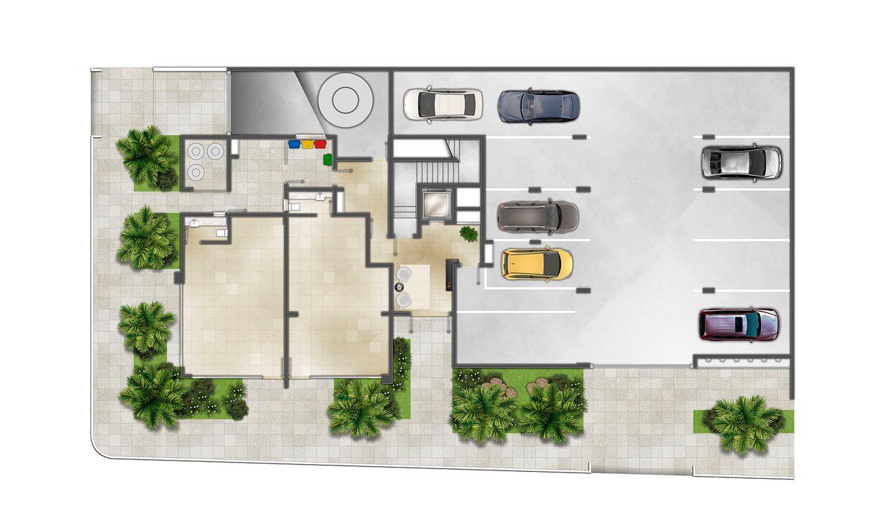 Planta pavimento térreo/ Lojas, hall de entrada e garagem